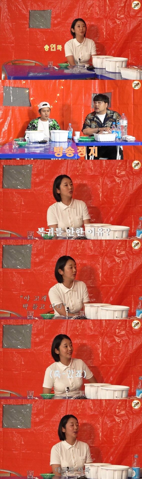 '개그우먼 송인화 출연!! 8년 전 무슨 일이 있었길래? 다 말해줄게요~(1부)'라는 제목의 영상에서 송인화는 개그맨 김진곤, 기자 김현수와 포장마차 콘셉트의 자유로운 분위기로 인터뷰를 진행했다.