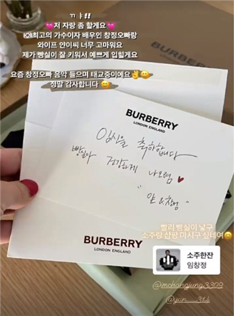 해당 글에서는 임창정이 적은 것으로 보이는 "임신을 축하합니다. 빵실아 건강하게 나오렴"이라는 쪽지가 함께 보였다.