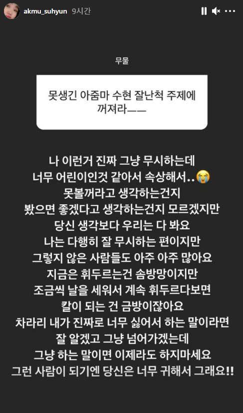 이에 이수현은 "나 이런거 진짜 그냥 무시하는데 너무 어린이인 것 같아서 속상하다"면서 "못 볼거라고 생각하는건지 봤으면 좋겠다고 생각하는건지 모르겠지만 당신 생각보다 우리는 다 본다"고 말했다.