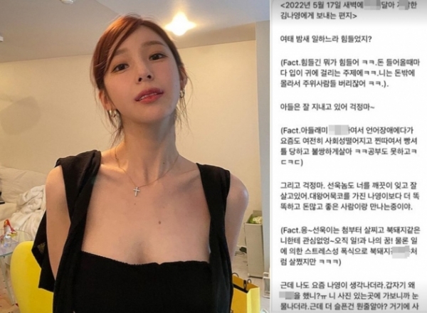 이 악플러는 "힘들긴 뭐가 힘드냐, 돈 들어올 때마다 입이 귀에 걸리는 주제에, 너는 돈밖에 몰라서 주위 사람들 버리잖아. 아들은 사회성이 떨어지고 빵셔틀당하고 공부도 못하고 불쌍하게 산다. 선욱이(작가의 남자친구)는 처음부터 살찌고 XX같은 너한테 관심 없었어. 남자들이 너 욕하더라"라며 험담을 쏟아냈다.
