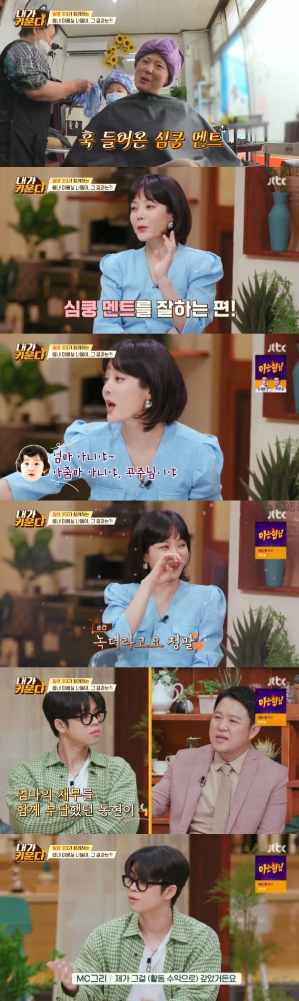 이날 김현숙은 친정 엄마의 단골 미용실을 찾았다. 하민이가 펌을 하다가 자신도 즉석에서 펌을 결정해 웃음을 샀다. 김현숙은 거울을 보면서 "이런 펌 오랜만에 말아본다"라며 살짝 긴장한 모습을 보였다. 이어 "왜 난 스카프를 쓴 게 더 예쁘지?"라는 말을 하자, 하민이는 "원래 엄마는 예쁘니까"라는 '심쿵' 멘트를 해 모두를 놀라게 만들었다.