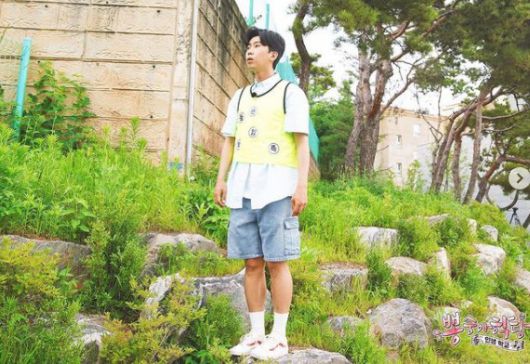 사진 속 임영웅은 청 반바지에 셔츠, 형광 컬러 조끼를 매치하면서 남다른 패션 센스를 뽐내고 있는 모습. 임영웅은 무언가를 바라보며 깜짝 놀란 표정을 짓고 있다.