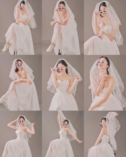 사진 속 김윤지는 순백의 웨딩드레스를 입었다. 여기에 선글라스와 스니커즈를 매치해 자신만의 개성을 살렸다. 익살맞은 포즈와 표정이 보는 이를 웃음 짓게 만든다.