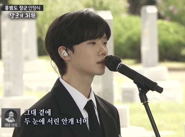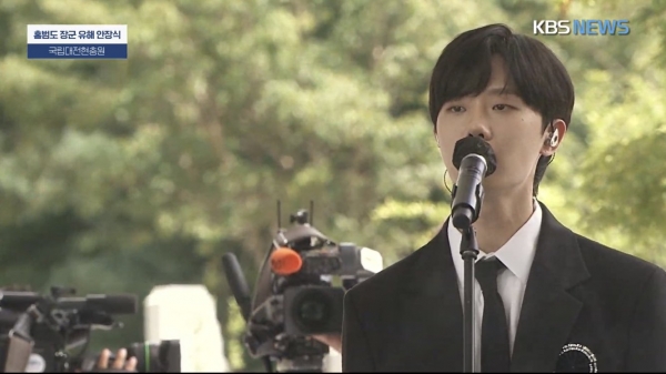 [스타인뉴스 황하현 인턴기자] 서거 78년 만에 고국 땅으로 돌아온 독립운동가 홍범도 장군의 유해 안장식이 오늘(18일) 오전 국립대전현충원에서 열렸다. '호피폴라'의 하현상은 안장식에 참석하여 tvN '미스터 션샤인'의 ost인 '바람이 되어'를 불렀다. '바람이 되어'는 잔잔하게 마음을 울리는 멜로디와 하현상의 쓸쓸하면서도 짙은 감성의 목소리가 더해진 곡이다. 경건한 자세로 두 눈을 꼭 감고 진심을 다해 부르는 하현상의 모습 위로 홍범도 장군의 영정과 훈장 등이 겹쳐지며 많은 사람들의 감성을 울렸다.