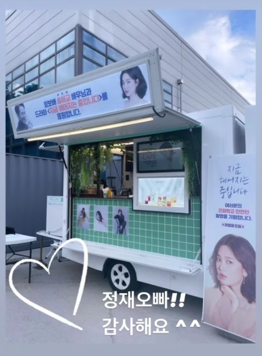공개된 사진 속에는 이정재가 송혜교의 드라마 '지금 헤어지는 중입니다' 촬영장에 보낸 커피차 사진이 담겼다. 이에 송혜교는 인증샷을 찍어 올리며 감사를 표했다.
