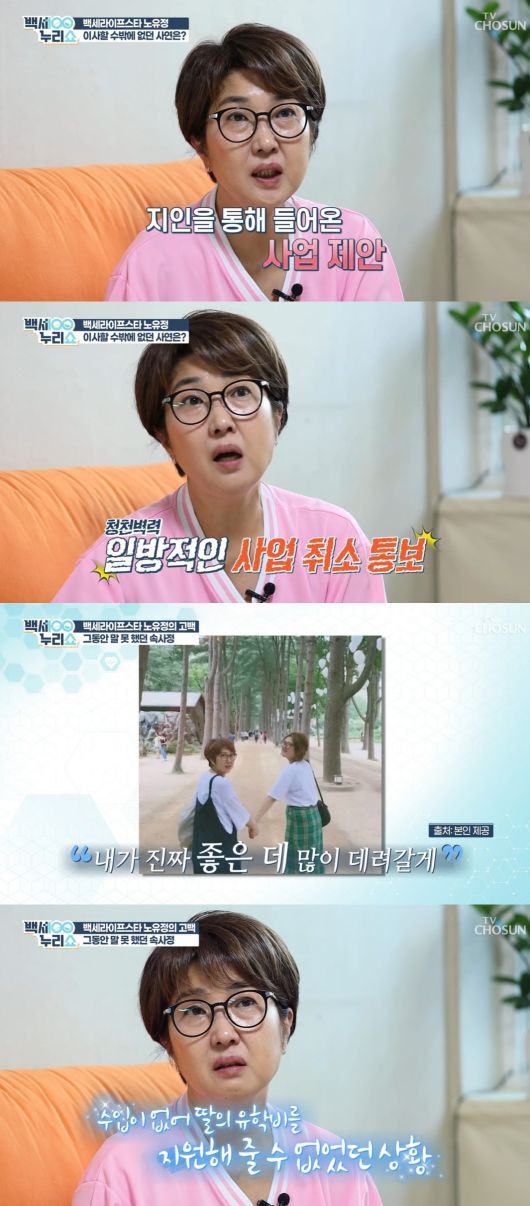 최근 노유정은 지인의 제안으로 사업을 구상했다. 그러나 이마저도 무산됐다고. 노유정은 “지인이 유튜브를 통해 홈쇼핑을 하자더라. 설거지보다 났다 싶었다. 사무실이 집 근처라 차비라도 절약할 수 있겠더라”라며 무리해서 이사를 했다고 설명했다.