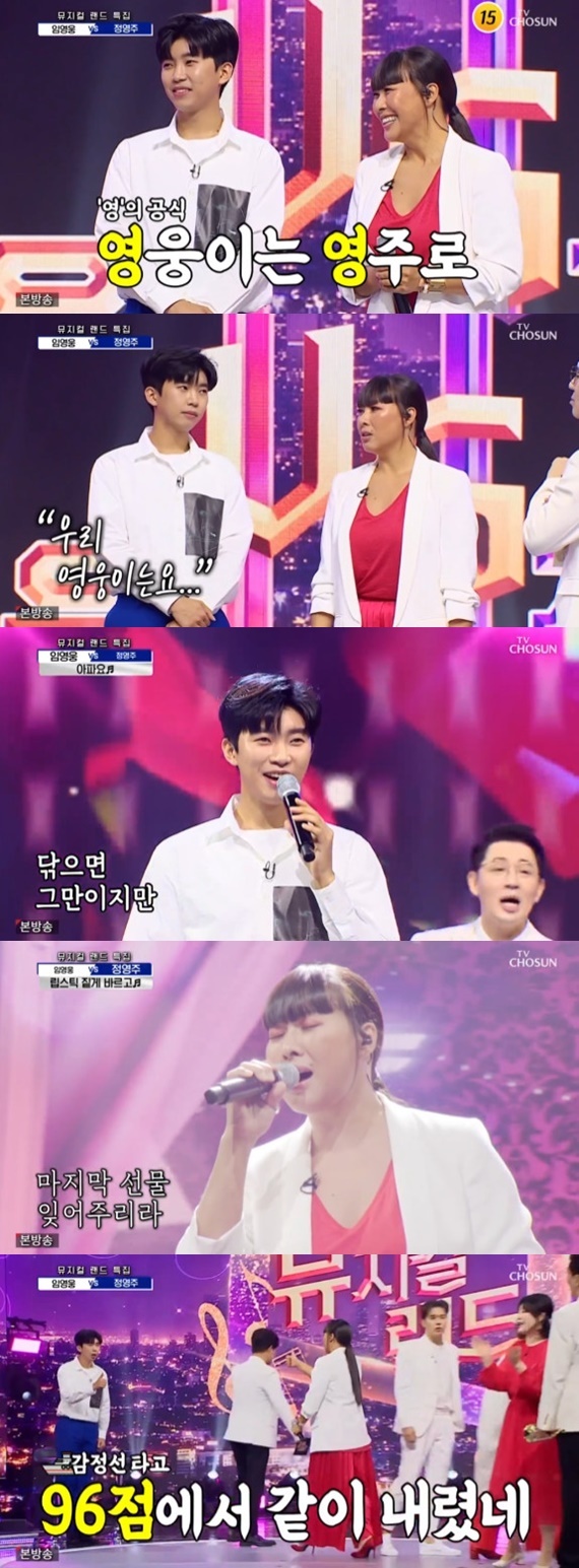 이에 임영웅이 수근의 '아파요', 정영주가 임주리의 '립스틱 짙게 바르고'를 선곡해 우열을 가릴 수 없는 무대를 선보였다. 감탄을 자아내는 두 사람의 무대는 96점 동점을 기록해 놀라움을 더하며 훈훈한 마무리를 지었다.
