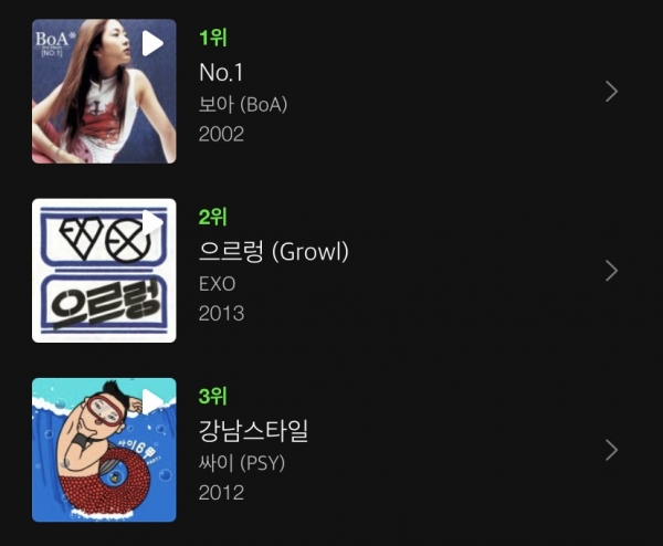 1위는 보아의 'No.1', 2위는 엑소의 '으르렁', 3위는 싸이의 '강남스타일'이 선정되었다. 그 외에도 4위 방탄소년단의 'Dynamite', 5위 소녀시대의 'Gee', 6위 소녀시대의 '다시 만난 세계', 7위 2ne1의 '내가 제일 잘 나가' 등이 순위에 올랐다.