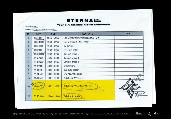 모든 순간을 노래하는 밴드 데이식스의 베이시스트와 작사 작곡을 담당하는 영케이가 오는 9월 6일 멤버 최초로 솔로 미니앨범을 발매한다. 지난 8월 20일에는 솔로 앨범 발매를 알리는 포스터가 공개되었고, 23일에는 Solo Debut Scheduler라는 공개 예정인 여러 콘텐츠들의 일정을 알리는 이미지가 업로드되었다. 또한 25일에는 앞서 적힌 짧은 글을 나레이션하는 매일 밤 10시에 ‘데이식스의 키스더 라디오’를 진행하고 있는 DJ이기도 한 영케이의 목소리와 발매될 곡으로 추정되는 음악이 배경음악으로 깔린 애니메이션이 공개되었다. 「Eternal」이라는 이름의 미니 앨범이 추구할 방향성을 담은 내용일 것으로 예상된다.