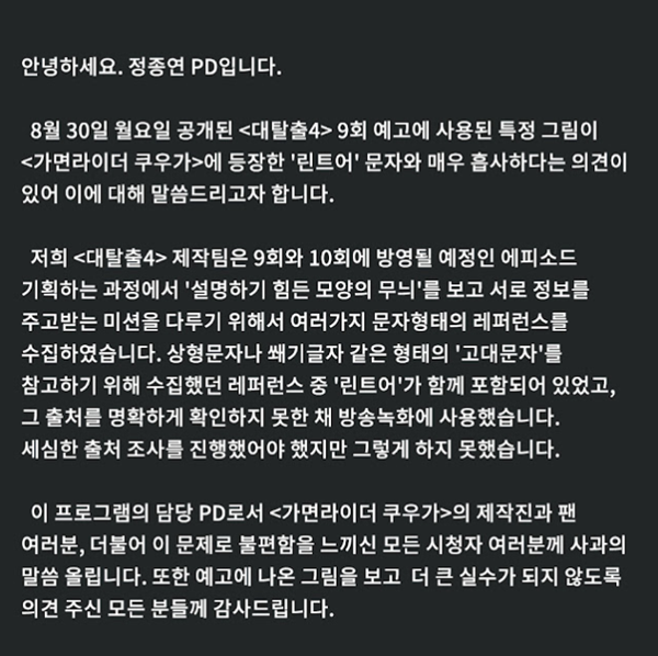 글에서 정 PD는 "8월 30일 공개된 '대탈출4' 9회 예고에 사용된 특정 그림이 '가면라이더 쿠우가'에 등장한 '린트어' 문자와 매우 흡사하다는 의견이 있었다'고 언급했다.