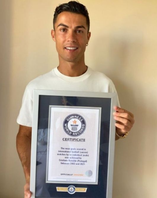 호날두는 4일(한국시각) 자신의 SNS에 기네스월드레코드로부터 받은 A매치 최다골 기록 인증서를 받은 사진을 게시했다.