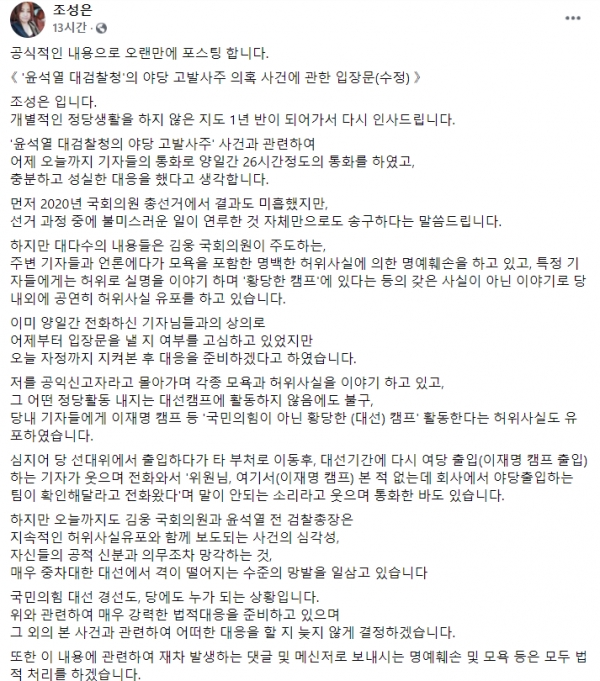 조성은씨는 "선거 과정 중에 불미스러운 일이 연루된 것 자체만으로도 송구하다"면서도 "대다수의 내용은 김웅 국회의원이 주도하는 주변 기자들과 언론상 모욕을 포함한 명백한 허위사실에 의한 명예훼손"이라며 자신을 둘러싼 세간의 의혹을 전면 부인했다.