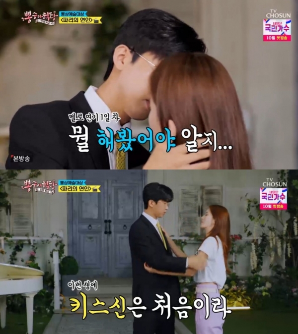 이어 임영웅은 상대 배우인 이가령과 ‘박력 고백신’을 연기하던 중 대사를 계속 깜빡해 눈길을 끌었다. 이후 대사를 마친 임영웅은 하이라이트인 ‘키스신’ 차례가 되자, “가글 안 했거든요”라며 너스레를 떨었다. 그러자 감독을 맡은 붐이 “유기농으로 갈게요”라고 답해 웃음을 안겼다.