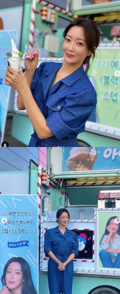사진 속 김희선은 단정하게 묶은 머리 스타일과 파란색의 점프슈트 차림으로 커피차 앞에서 투명한 컵에 담긴 아이스크림을 들고 카메라를 응시하며 포즈를 취하고 있다. 특히 결점 하나 없는 매끈한 피부와 작은 얼굴에 크고 또렷한 이목구비를 뽐내며 인형 같은 비주얼을 자아냈다.