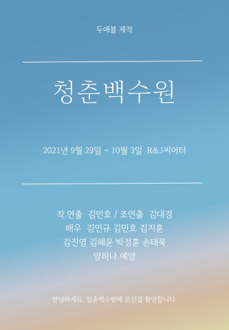 [스타인뉴스 김성기 기자] 극단 혜화공감은 9월 29일 2021년 극단 ‘두애블’의 창단공연 연극 ‘청춘백수원’을 관객들에게 선보인다고 16일 밝혔다. 극단 혜화공감은 연극 청춘백수원의 홍보와 기획을 맡고 있다.