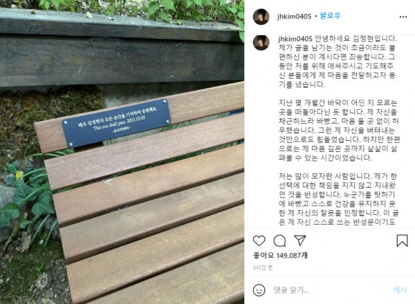 김정현은 25일 오후 인스타그램에 '배우 김정현의 모든 순간을 기억하며 응원해요'라는 문구가 적힌 벤치 사진과 함께 장문의 글을 게재했다.