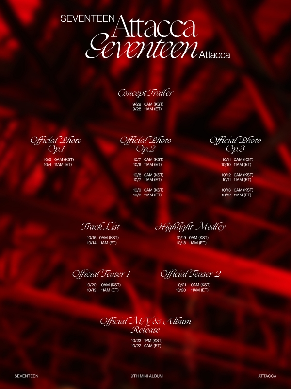 정열적인 붉은색 배경의 프로모션 스케줄러 이미지는 앞서 공개된 티징 이미지에 이어 세븐틴이 이번 미니 9집 'Attacca'로 어떤 이야기를 펼칠지 궁금증을 끌어올렸다.