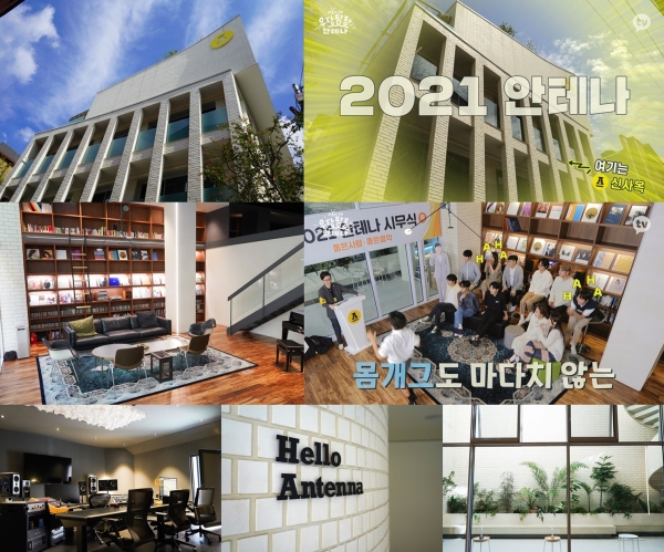 깔끔한 외벽과 샛노란 안테나 로고로 꾸며져 유쾌, 화사한 모습으로 보는 이들을 맞이하는 건물 외부는 물론, 편안하고 아늑한 분위기의 라운지, 각종 기기와 장비들로 가득 찬 작업실 등 곳곳에 아티스트들을 위한 배려가 드러난다. 특히 모든 안테나 식구들이 한자리에 모이기에도 넉넉한 듯 보이는 라운지는 우드 소재와 따뜻한 조명으로 편안하면서도 생기있는 분위기를 조성, 이 곳에서 펼쳐질 이들의 좌충우돌 웃음만발 활약을 기대케 한다. 여기에 안테나 식구들의 프로페셔널한 아티스트적 모먼트까지 듬뿍 담길 녹음실, 평화로운 분위기에서 힐링을 도울 휴게 공간까지 함께 공개됐다.