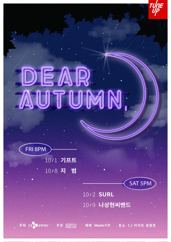 [스타인뉴스 황하현 인턴기자] 밴드 기프트가 어제(10일) 진행된 TUNE UP STAGE [Dear Autmn] 공연을 성공적으로 마쳤다. '튠업'은 뮤지션 지원 사업으로, 재능과 실력을 갖춘 젊은 뮤지션들이 음악 시장에 성공적으로 진출할 수 있도록 체계적으로 지원하는 CJ문화재단의 대표 프로그램이다. 앨범 제작과 발매에서 국내외 공연, 아지트 라이브 출연, 홍보마케팅까지 적극적으로 지원하여 다양한 장르의 음악을 국내외 관객에게 소개하고 전달함으로써 대중음악 생태계를 더욱 건강하게 가꿔가고 있다. 그 첫 주자는 밴드 기프트였으며 기프트 외에도 지범, SURL, 나상현씨밴드가 공연을 선보일 예정이다. [Dear Autmn] 공연에서 기프트는 그런 사람, 나와 함께, Stay the name, 넌 나에게 등의 기프트의 곡들과 델리스파이스의 고백, 넬의 기억을 걷는 시간, 디어클라우드의 얼음요새 등의 곡들을 기프트만의 감성으로 리메이크한 무대들을 관객들에게 선물하였다. 그리고 기프트에게 궁금한 점이나 응원의 글을 작성하면 기프트가 5명을 선정해 친필 싸인 CD를 증정하는 이벤트와 모든 관람객들에게 디어 어텀 파우치를 증정하는 이벤트가 있었다.