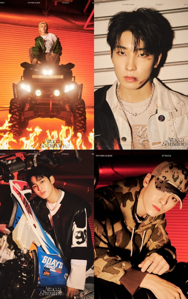공개된 사진 속 에스쿱스는 사륜 바이크에 올라타 힙한 매력을 물씬 드러내고 있으며, 원우는 날카로운 눈빛으로 독보적인 카리스마를 발산하고 있다. 민규는 바이크에 몸을 기댄 채 터프한 매력을, 버논은 와일드한 무드 속 치명적인 섹시미를 자아내 눈길을 끌었다.