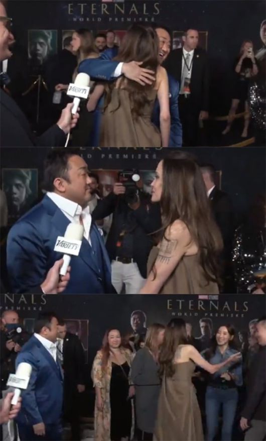테나 역을 맡은 안젤리나 졸리가 미국 매체 버라이어티와 레드카펫 인터뷰를 진행하던 중 마동석이 안젤리나 졸리에게 인사를 건넸다. 두 사람은 포옹하며 반갑게 인사했다. 이후 손을 맞잡은 채 안부 인사말을 주고 받았다. 마동석은 자신의 동행인들과 함께 연인인 예정화를 안젤리나 졸리에게 소개했다. 마동석은 예정화를 가리키며 "예"라고 했고 안젤리나 졸리는 예정화를 끌어안으며 반가워했다.
