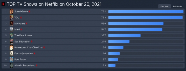 [스타인뉴스 최민희 인턴기자] 각종 OTT 서비스 작품들의 장르별 순위를 발표하는 사이트 FlixPatrol에서 현지시각 20일, 넷플릭스 TV쇼 Top 10을 발표했다. 차트에 ‘오징어게임’, ‘마이네임’, ‘갯마을 차차차’가 순서대로 1위, 3위, 7위로 진입했다.