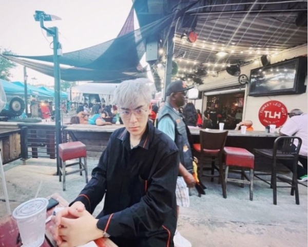 해외여행 중에 찍은 사진으로 보인다. 탑은 백발로 염색한 헤어스타일에 독특한 디자인의 의상으로 남다른 스타일을 완성했다.