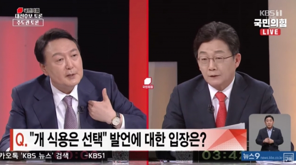 이에 유 후보는 "반려인들이 개 식용 문제에 굉장히 민감한데, 개인의 선택에 맡겨도 되겠나. 반려동물 학대에 직결된 문제"라고 반문했지만, 윤 전 총장은 "식용견은 따로 키우는 것"이라고 말해 논란이 일었다.