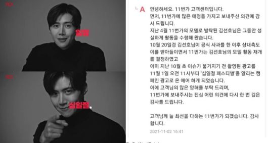 그가 공개한 사진에 따르면 11번가 측은 "지난 4월 11번가의 모델로 발탁된 김선호님은 그동안 성실하게 활동을 수행해 왔다"며 "10월 20일경 김선호님이 공식 사과를 한 이후 상대 측도 이를 받아들이면서 11번가는 김선호님의 모델 활동 재개를 결정했고 이미 지난 10월 초 이슈가 불거지기 전 촬영된 광고를 11월 1일 오전 11시부터 '십일절 페스티벌'을 알리는 캠페인 광고로 온에어하게 됐다"고 답했다.