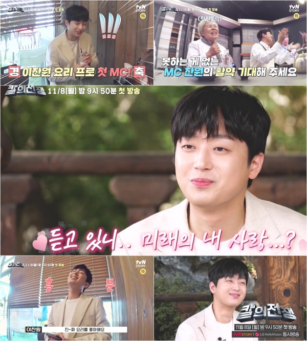 tvN STORY, LG헬로비전 新 예능 ‘칼의 전쟁’은 대한민국 팔도 대표 명인들이 각 지역의 명예를 걸고 향토 음식과 식재료를 소개하기 위한 대결을 펼치는 프로그램. ‘칼의 전쟁’은 ‘한식대첩’을 시즌4까지 성공적으로 이끈 제작진이 3년 만에 선보이는 정통 한식 예능으로, 이영자, 도경완, 이찬원이 3MC로 확정돼 기대감을 증폭시키고 있다. 이 가운데 ‘칼의 전쟁’을 통해 첫 요리 예능 고정 MC로 발탁된 이찬원의 선공개 영상이 깜짝 공개돼 이목을 끈다.