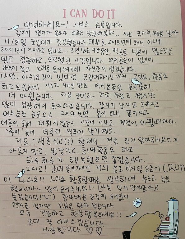 [스타인뉴스 이채원 기자] 그룹 느와르 멤버 이준용이 입대 소식을 전하며 팬들을 향한 손편지를 게재했다.
