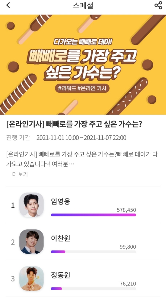 [스타인뉴스 양경모 기자] 가수 임영웅이 ‘빼빼로를 가장 주고싶은 가수는?’ 투표에서 1위를 차지했다.