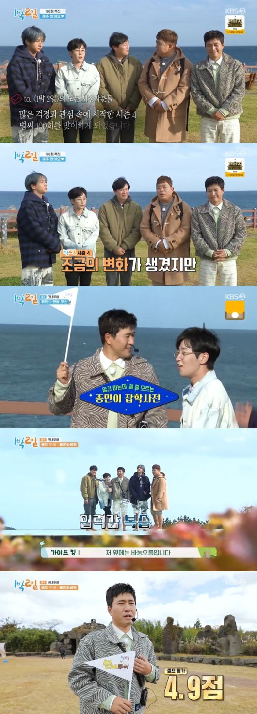 이어 사생활 논란으로 멤버 김선호가 하차한 가운데 제주도로 향한 멤버들의 100회 맞이 '단내 투어'가 시작됐다. 멤버들은 관광부터 식사, 액티비티까지 직접 여행 코스를 준비해 특별한 여행을 완성해나갔다. 그중에서도 관광 파트를 맡은 김종민은 노트에 빼곡하게 관광지에 대한 정보를 적어오고, 계속해서 노트에 시선을 고정한 채 의욕을 불태웠다.