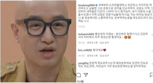 9일 홍석천은 인스타그램에 운동하는 영상을 올리며 "새벽부터 드라마 촬영하고 피곤하고 지치지만 머리 비우고 싶을 때 그냥 운동으로 생각을 단순히 하자"고 적었다.