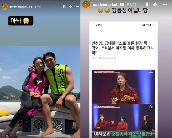 이 과정에서 일부 온라인 커뮤니티에서는 해당 운동선수가 김동성이라는 루머가 나돌았다. 이에 아내 인민정이 “김동성 아닙니다”라고 일축한 것이다. 그러면서 남편 김동성과 어깨동무를 하고 찍은 사진을 올리며 애정을 과시했다.