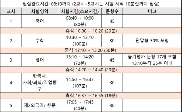 3교시 영어영역은 오후 1시 10분부터 2시 20분까지다. 20분간의 쉬는 시간이 끝난 후 4교시 한국사·탐구영역이 오후 2시 50분부터 4시 37분까지 이어진다.
