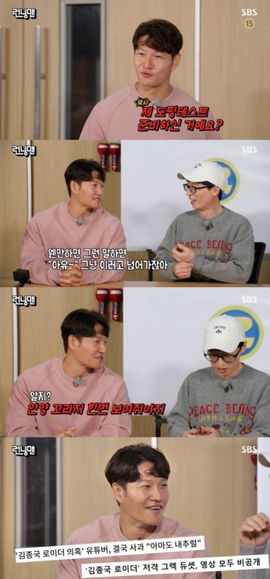 유재석은 김종국에게 로이더 의혹을 제기한 헬스 유튜버 그렉 듀셋을 언급하며 "그분이 종국이를 잘 몰라서 그런 것 같다"라며 웃었다. 양세찬 또한 "잘못 걸렸다"고 거들었다.
