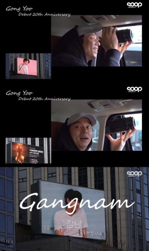 공개된 영상 속에는 공유의 데뷔 20주년을 맞이해 팬들이 준비해준 축하 이벤트 광고 영상을 보기 위해 신사역을 찾은 공유의 모습이 담겼다.