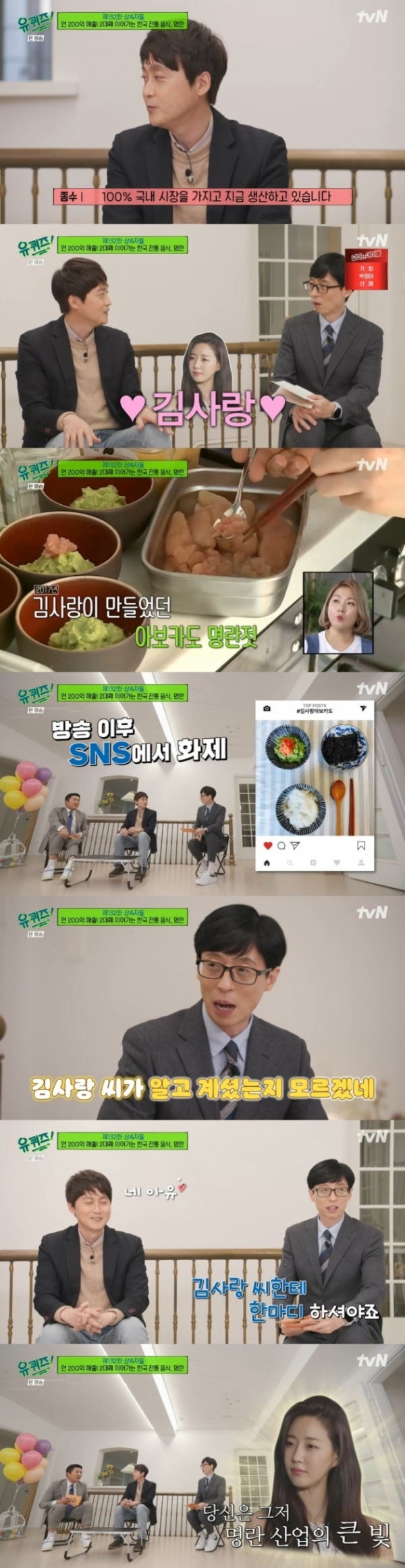 김사랑은 MBC '나 혼자 산다'에 출연, 아보카도 명란젓을 만들어 화제를 모았었다. 장 대표는 "그 방송 이후 정말 인기를 끌었다. 그해 매출이 110억 원이었다"라고 해 놀라움을 자아냈다.