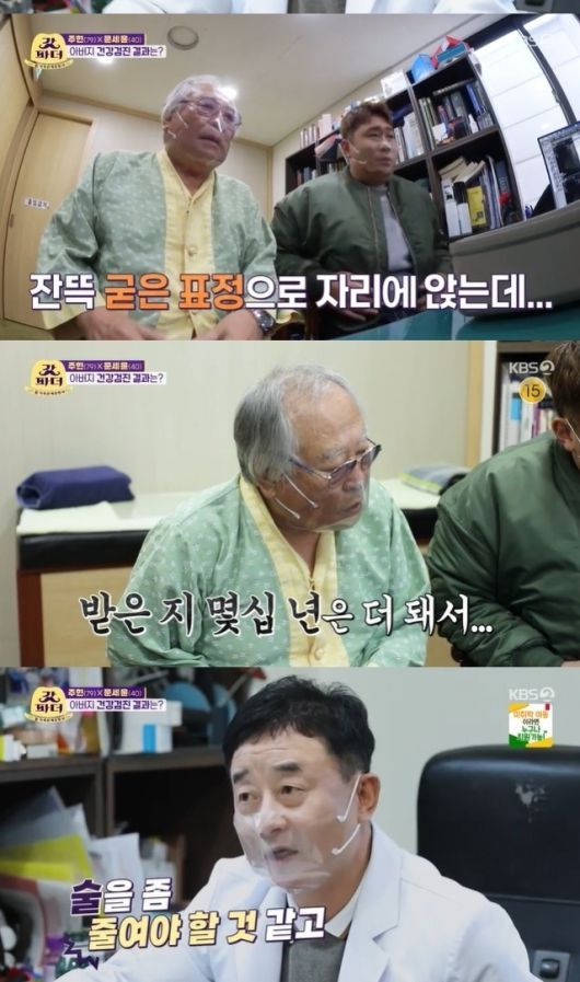 문세윤은 의사에게 "일주일에 10번은 드시는데 8번이라고 썼다. 담배는 끊으신 지 오래됐다. 한창 때는 60개비를 펴서 이혼당할 뻔했다고 한다. 무릎도 안 좋으시다"라며 고자질했다.