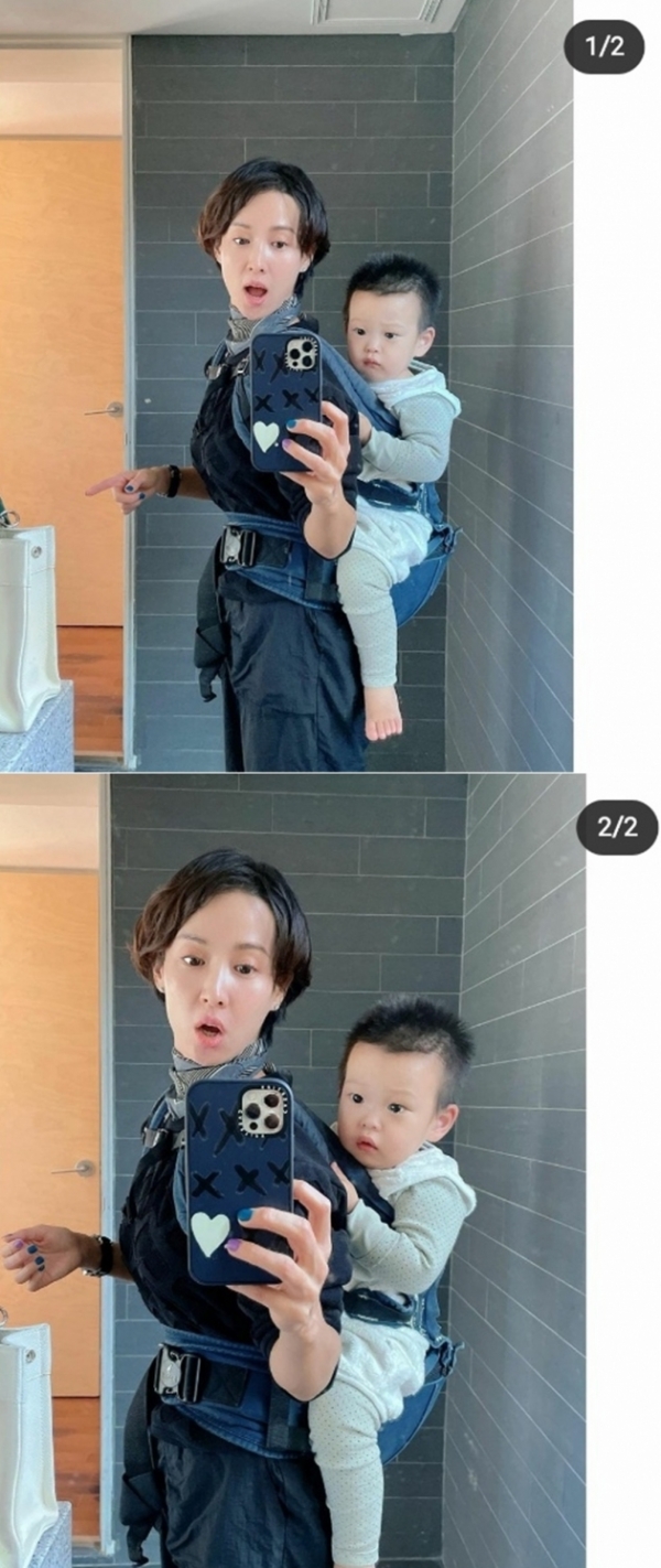 공개된 사진 속 조여정은 조카로 추정되는 아기를 등에 업고 실내에서 거울 셀카를 남기고 있다.