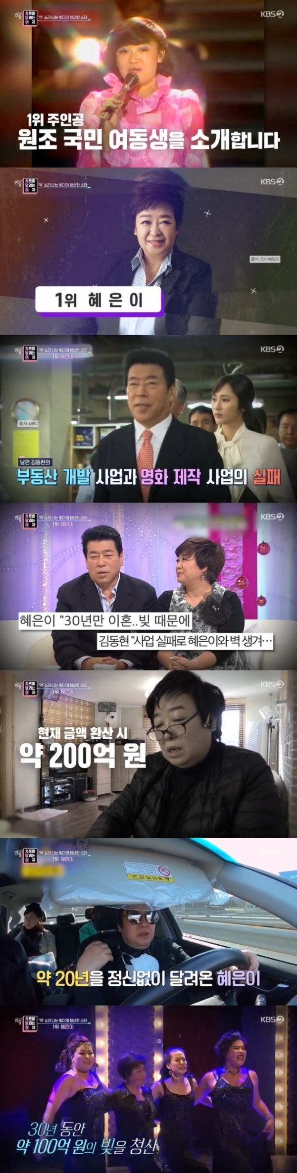 혜은이는 전 남편인 배우 김동현의 빚을 모두 떠안게 됐다고. 김동현은 오래 전 부동산 개발, 영화 제작 등 여러 사업에 잇따라 실패하며 수백 억 원의 빚을 졌었다. 이 빚이 보증을 섰던 아내 혜은이에게 돌아간 것. 하지만 두 사람은 각자의 길을 가기로 결심하고 이혼하게 됐다.