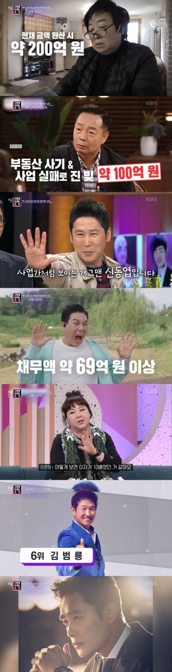 지난 3일 방송된 KBS 2TV '연중라이브'에서는 '억 소리 나는 빚더미 청산한 스타'들의 순위를 발표했다. 이병헌부터 김범룡, 이상민, 이은하, 신동엽, 김학래 임미숙 부부, 혜은이까지 다양한 스타들이 이름을 올렸다.