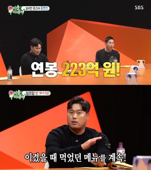 이날은 스페셜 MC로 ‘코리안 몬스터’ 류현진이 출연해 메이저 토크를 선보였다. MC 신동엽이 "토론토로 이적할 때 4년간 8000만 달러, 연봉으로 따지면 1년에 223억이다. 팀내 최고 연봉이자 국내 운동선수 중 역대 최고"라고 소개하며 “팀에서 연봉킹 대접을 해주냐?”고 질문했다. 류현진은 “첫 해에는 당연히 해줬고, 작년에는 외야수 선수가 저보다 훨씬 더 많은 금액을 받아서 제가 2등으로 밀려났다"며 쑥스러워했다.