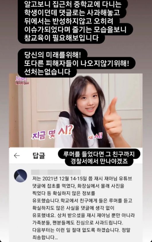 공개된 사진 속에는 A씨가 올린 사과글이 담겼다. A씨는 댓글을 통해 "나는 2021년 12월 14-15일쯤 재시, 재아님 유튜브 댓글에 '잡초를 먹였다', '화장실에서 몰래 사진을 찍었다' 등 확실하지 않은 정보를 유포했다. 학교에서 친구들에게 들은 루머를 듣고 확실하지도 않은 사실을 댓글에 생각 없이 유포했다"며 "상처받았을 재시, 재아님 뿐만 아니라 가족분들, 팬분들께도 진심으로 사과드린다. 다음부터는 이런 일 절대 없도록 하겠다"고 말했다.