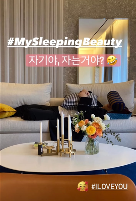 한예슬은 사진 상단에 'My Sleeping Beauty', 하단에 'I LOVE YOU' 문구도 태그해 남자친구에 대한 애정을 드러냈다.