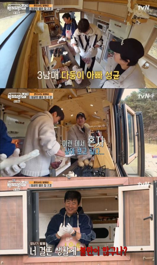 김성균은 "저는 가족이 많잖아요. 와이프랑 '이런 데 오면 이런 데서 혼자 살아보고 싶다'는 이야기를 항상 한다"고 털어놨다. 이에 성동일은 "처음으로 나오네 이 얘기가"라고 반응했고, 김성균은 "혼자만의 조용한 공간도 있으면 참 좋겠다"고 수습에 나섰다.