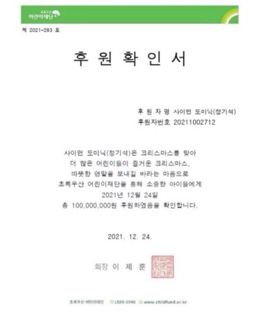 [스타인뉴스 박규범 기자] 가수 쌈디(사이먼 도미닉)가 크리스마스를 맞아 조카와 함께 찍고 받은 광고료 1억 원을 기부했다.