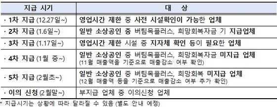 중기부는 이달 18일부터 영업시간 제한을 받았으나 최근 개업을 하는 등의 사유로 1차 지급 대상에 포함되지 못한 소상공인에게는 다음달 17일부터 방역지원금을 지급할 계획이다. 방역지원금 지원 대상은 이달 15일 이전에 개업한 소상공인과 소기업 중 매출이 감소했거나 감소가 예상되는 사업자다.