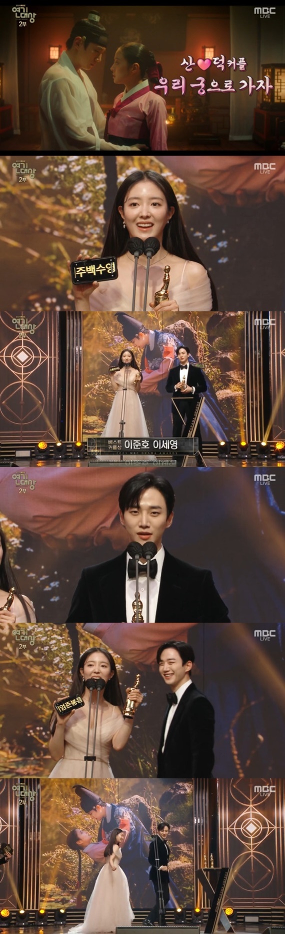 30일 오후 8시 40분 서울시 마포구 상암동 MBC 공개홀에서 열린 '2021 MBC 연기대상'에서는 '옷소매 붉은 끝동'의 이준호, 이세영이 시청자 투표로 선정되는 '베스트 커플상'에 호명됐다.